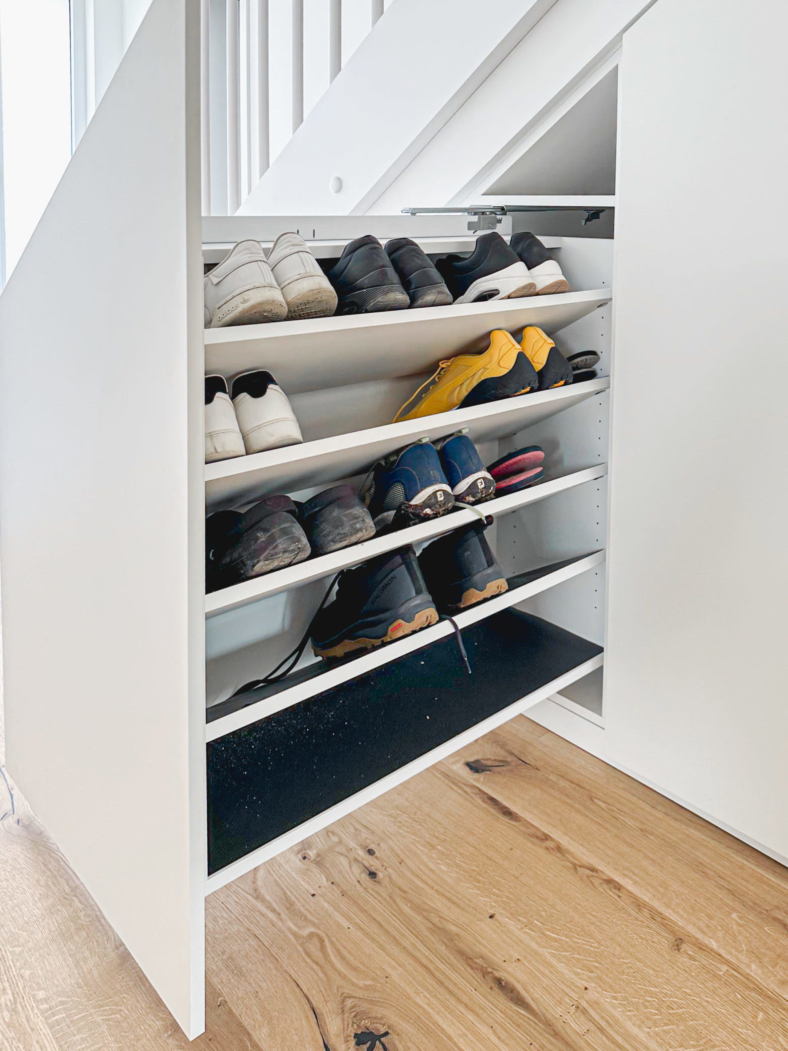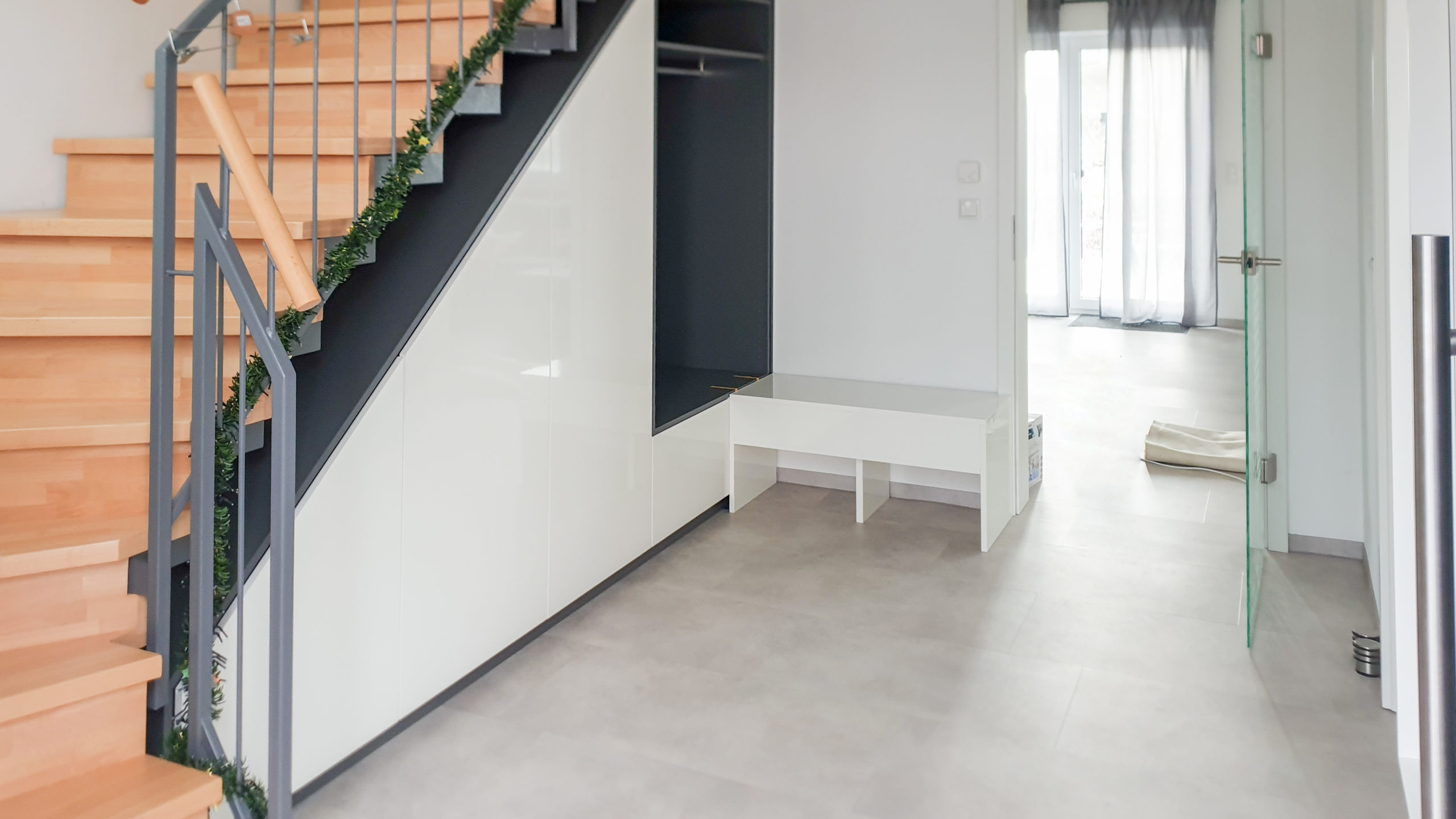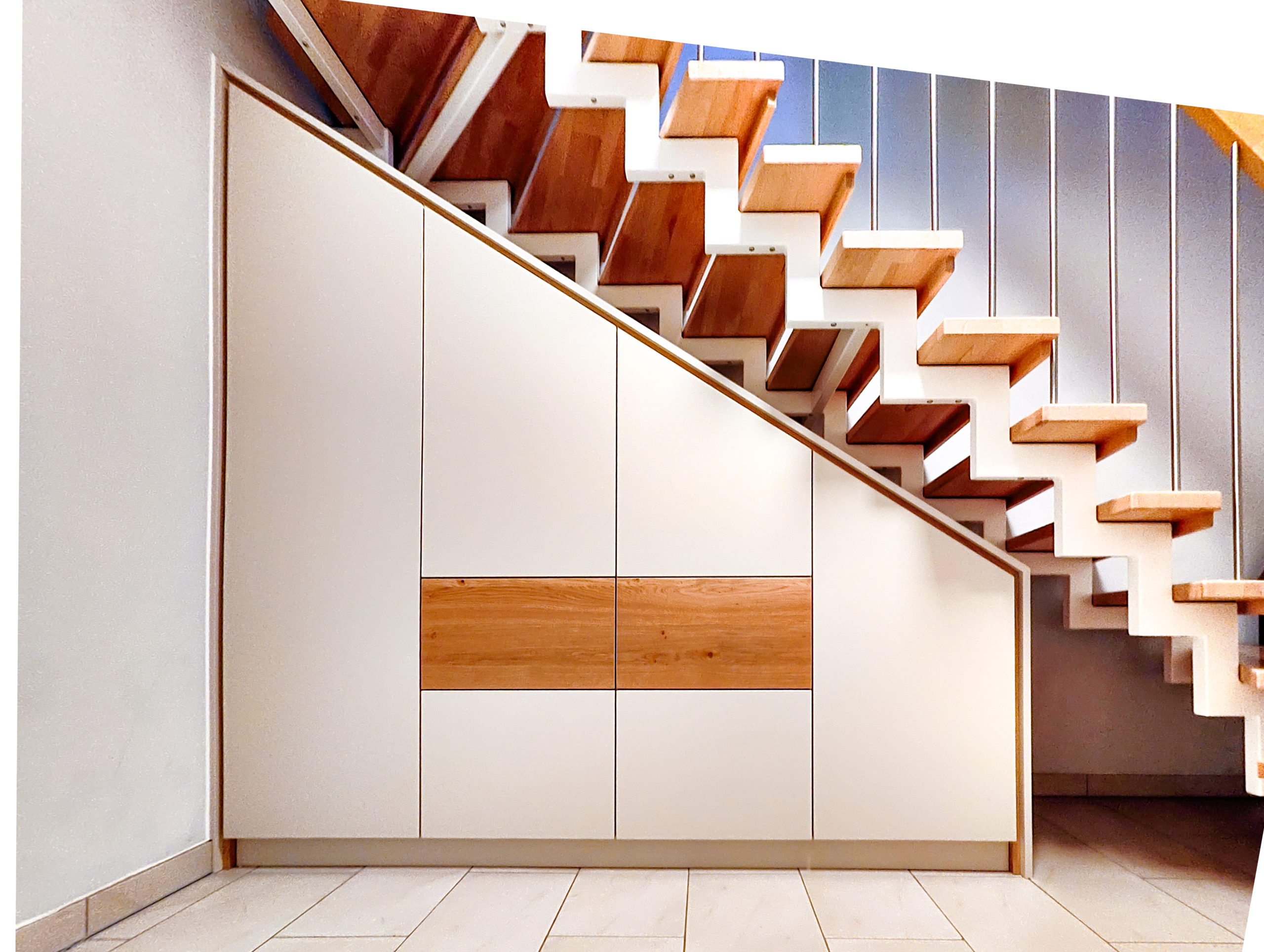 A custom staircase cabinet turns unused space beneath the stairs into valuable storage. Whether it’s a shoe cabinet under the stairs, a built-in unit beneath a sloped stairwell, or a staircase cabinet with pull-outs – we design your solution individually and with millimeter precision.