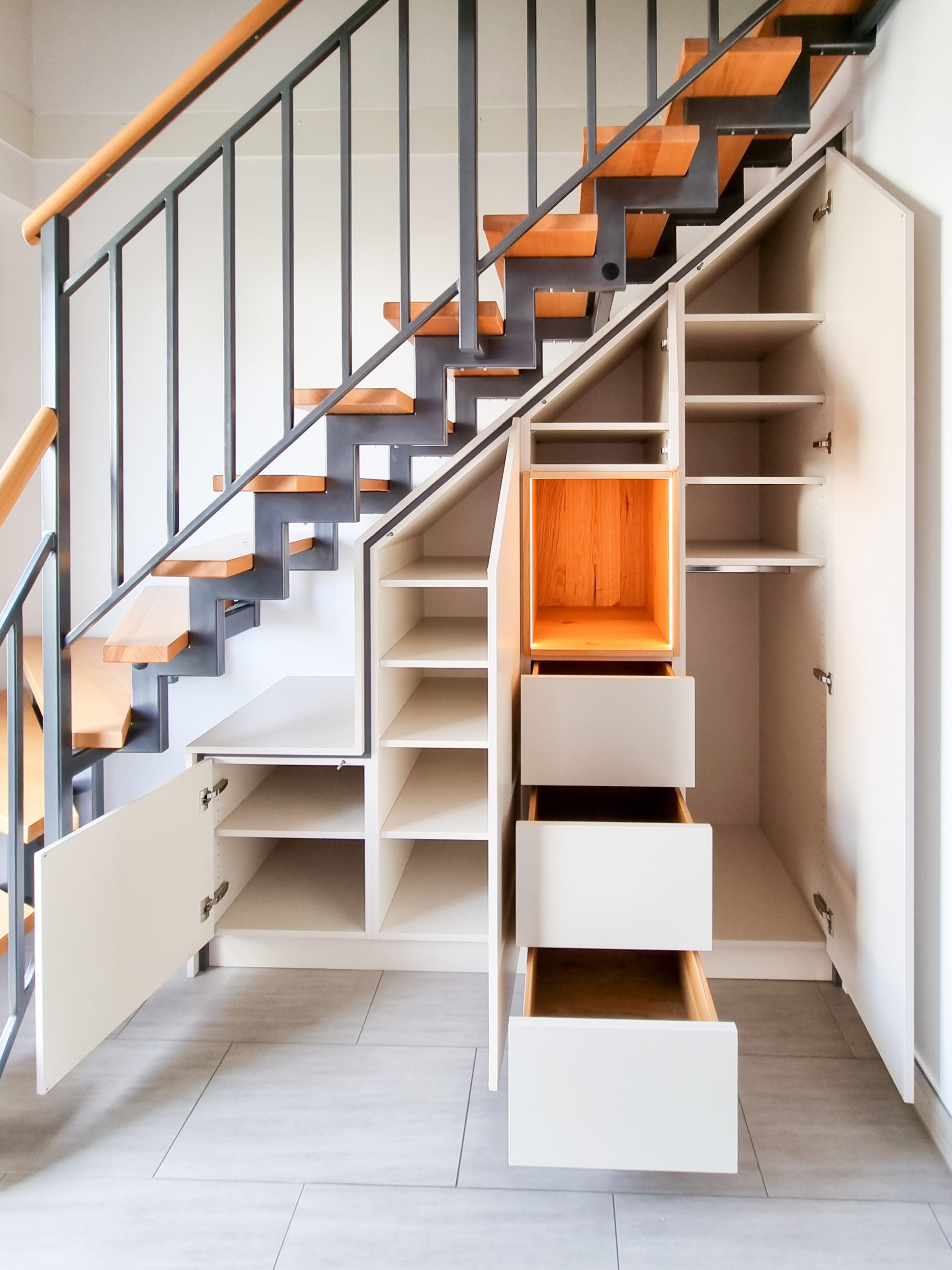 Your staircase cabinet doesn’t just fit into the room. It makes full use of it – and belongs right here.