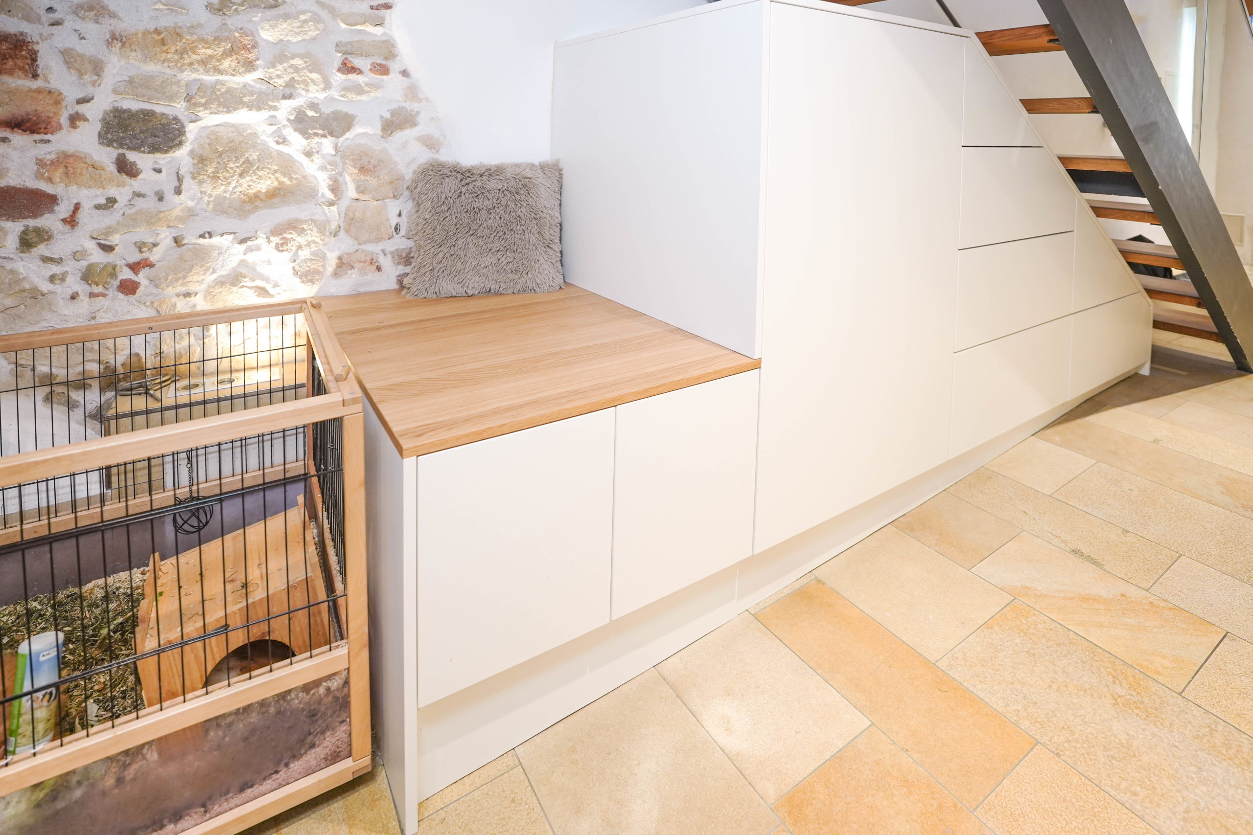 And the best part: our skilled carpenters plan, build, and install your staircase cabinet precisely in your home – for more order, more style, and more space.