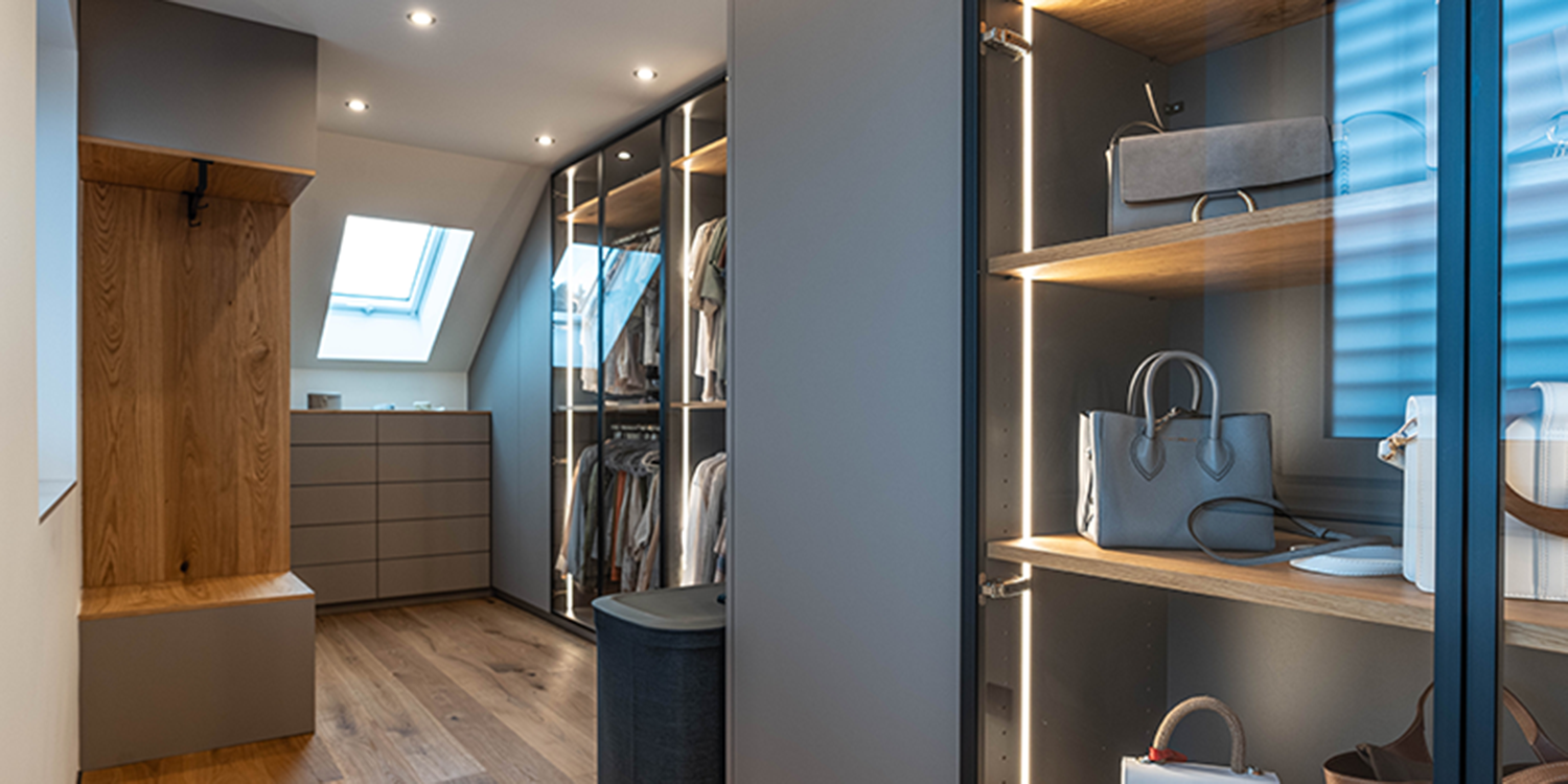 Our custom-made cabinets blend harmoniously into any room—whether under a sloping roof, in a dressing room, or as a coat rack in the hallway.