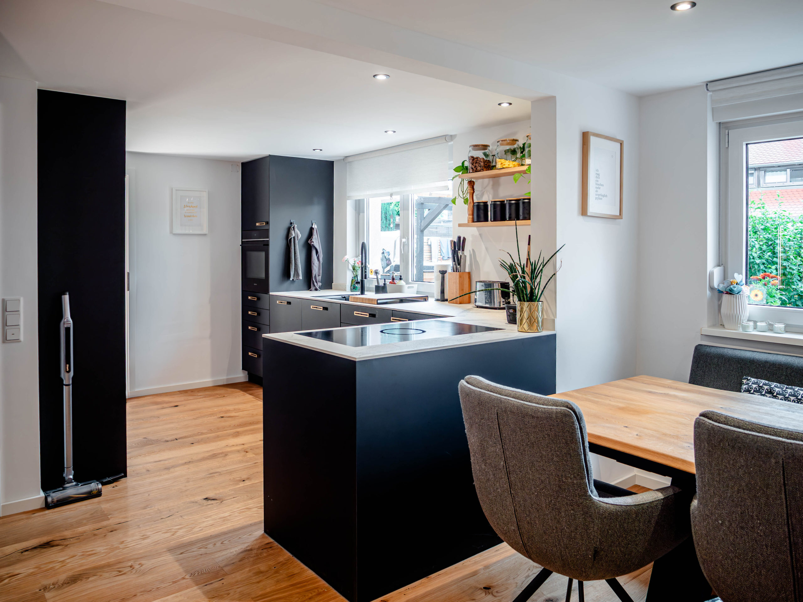 You decide the style: classic, modern, handleless, with wooden fronts or matt lacquered. We take care of the implementation – from planning and production to professional kitchen assembly by our carpenters. Our kitchen planning also includes individual extras such as integrated seating, illuminated niche shelving, made-to-measure kitchen worktops and cupboard solutions for the utility room.