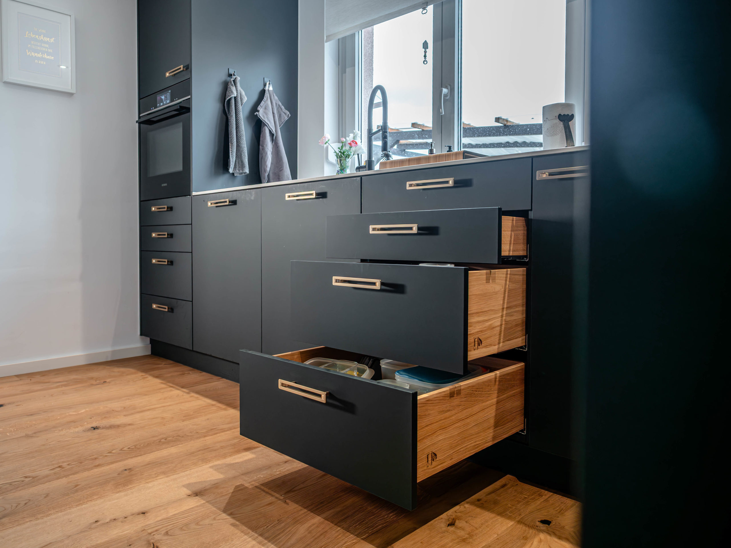 You have many options when it comes to adapting the interior of your cupboards and drawers to your individual needs. For example, you can choose different storage systems, such as pull-out baskets, drawers with dividers or customizable shelves. There are also special inserts for cutlery, spices or pots to ensure optimal organization. You can also consider whether you need special pull-outs or dividers for your kitchen appliances, such as blenders or saucepans. With the help of an experienced cabinet maker, you can discuss your wishes and requirements to ensure that the interior of your cabinets and drawers are perfectly tailored to your needs.