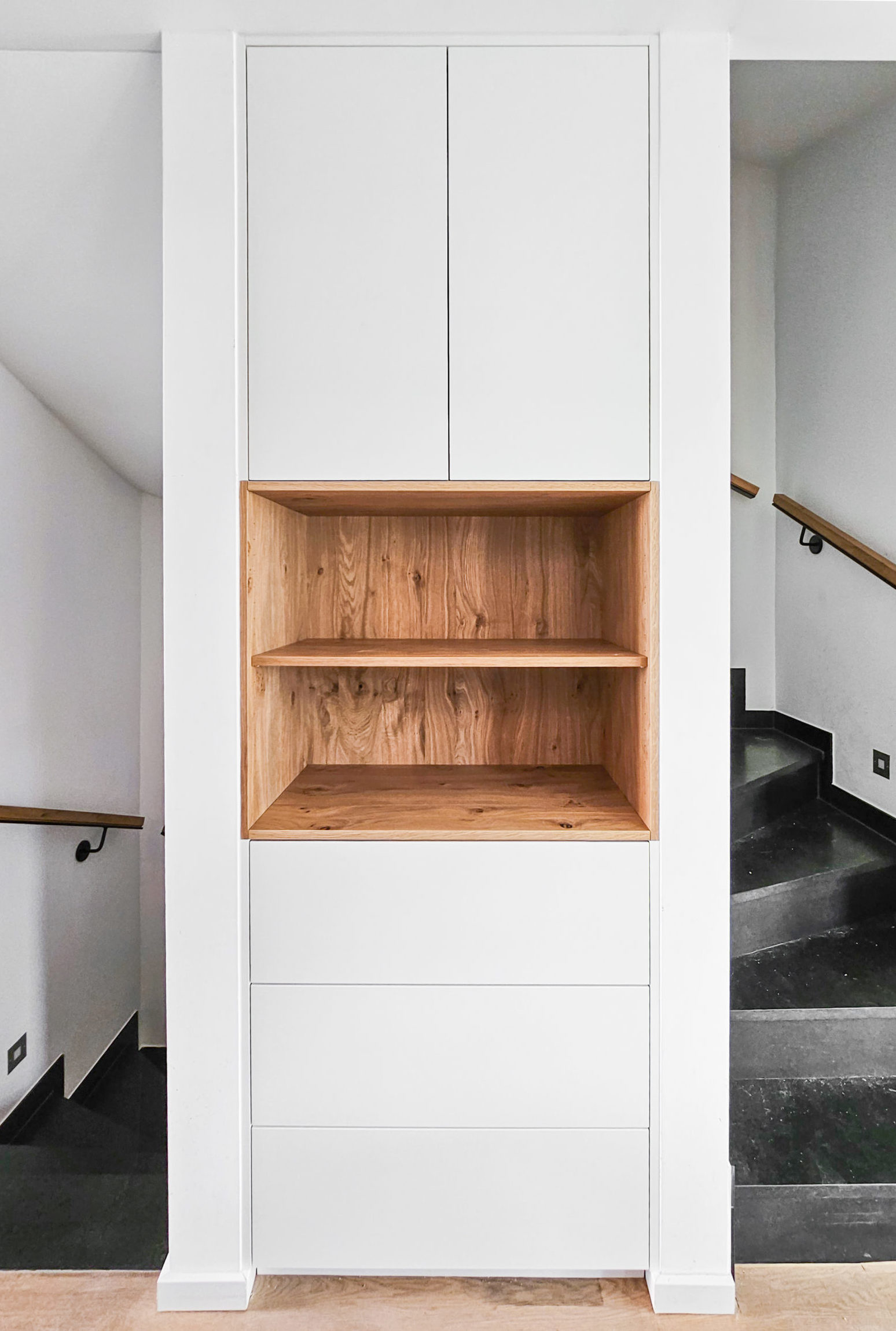 You have a narrow niche, a sloped ceiling, or want to make the most of the space under your stairs? Then a built-in cabinet in the niche is exactly what you need. Whether with sliding doors, open shelves, or clever pull-outs—we design custom niche cabinets that integrate perfectly into your architecture. Even for especially small spaces or challenging floor plans, we develop smart concepts that offer maximum storage.