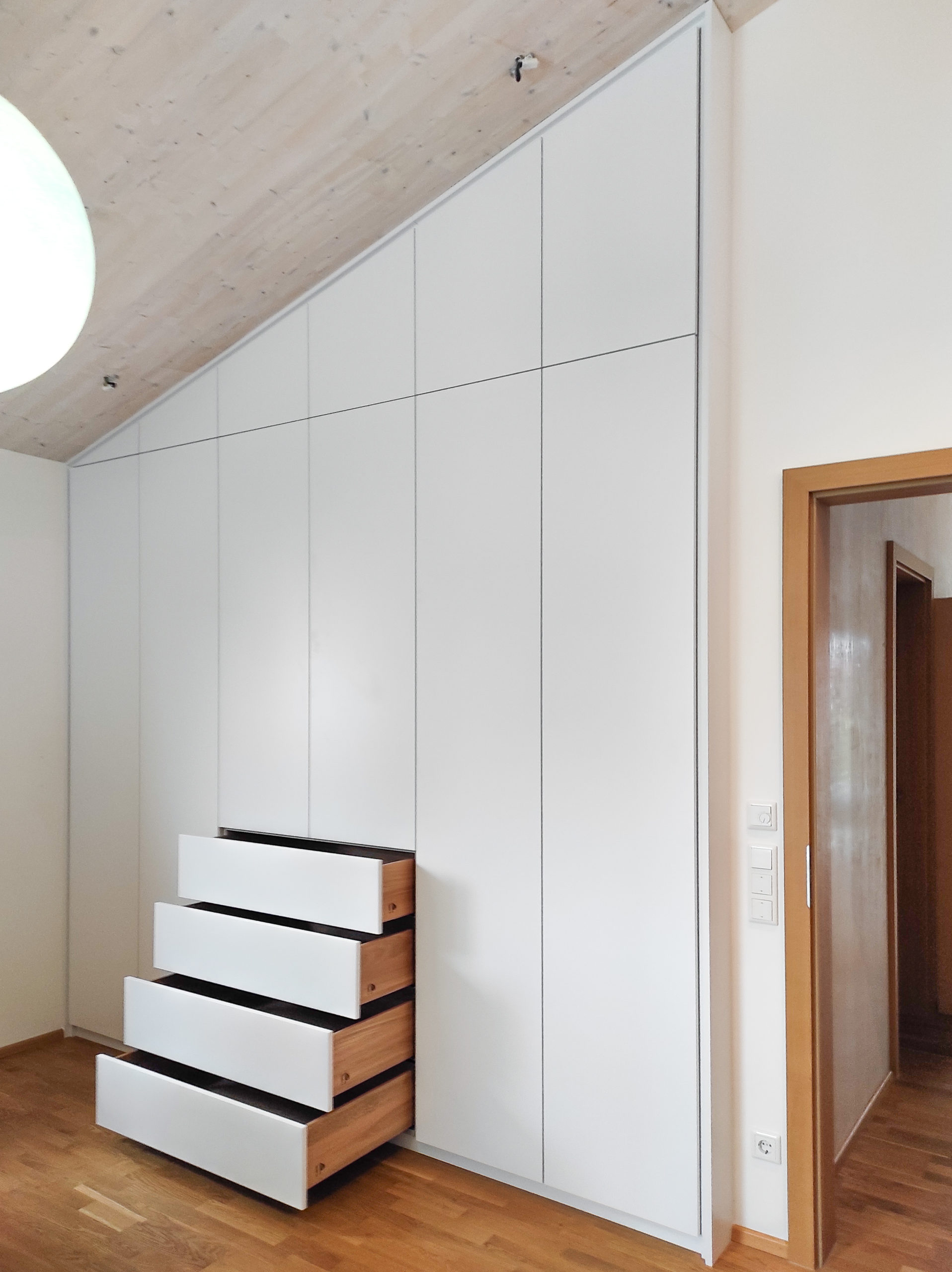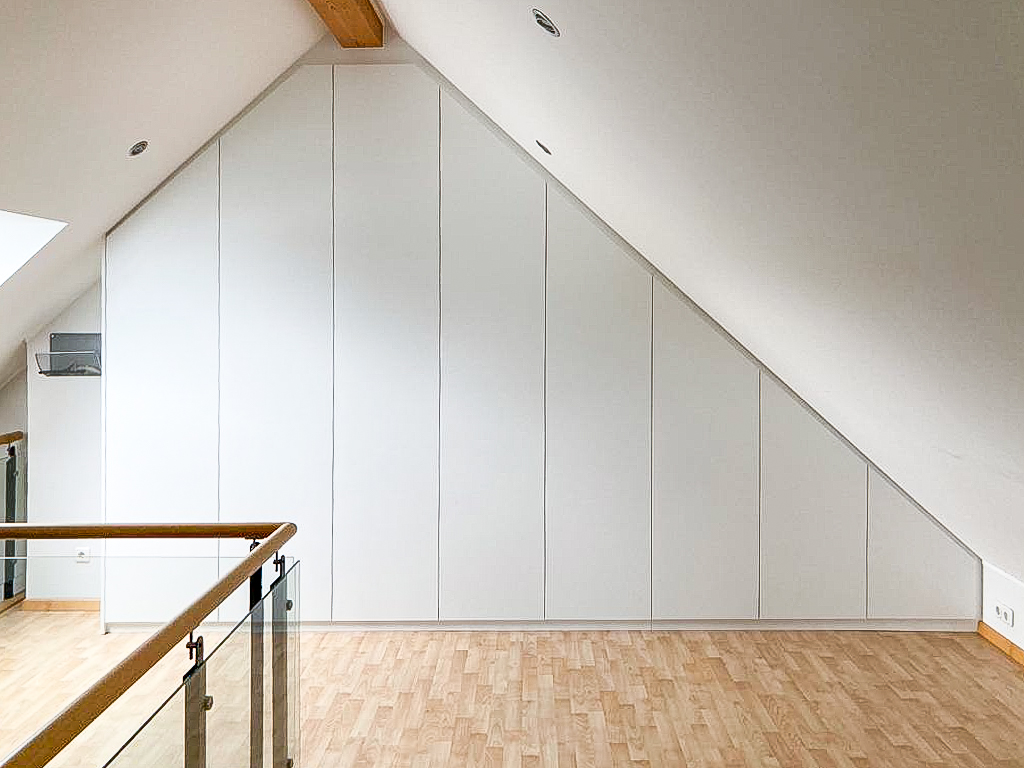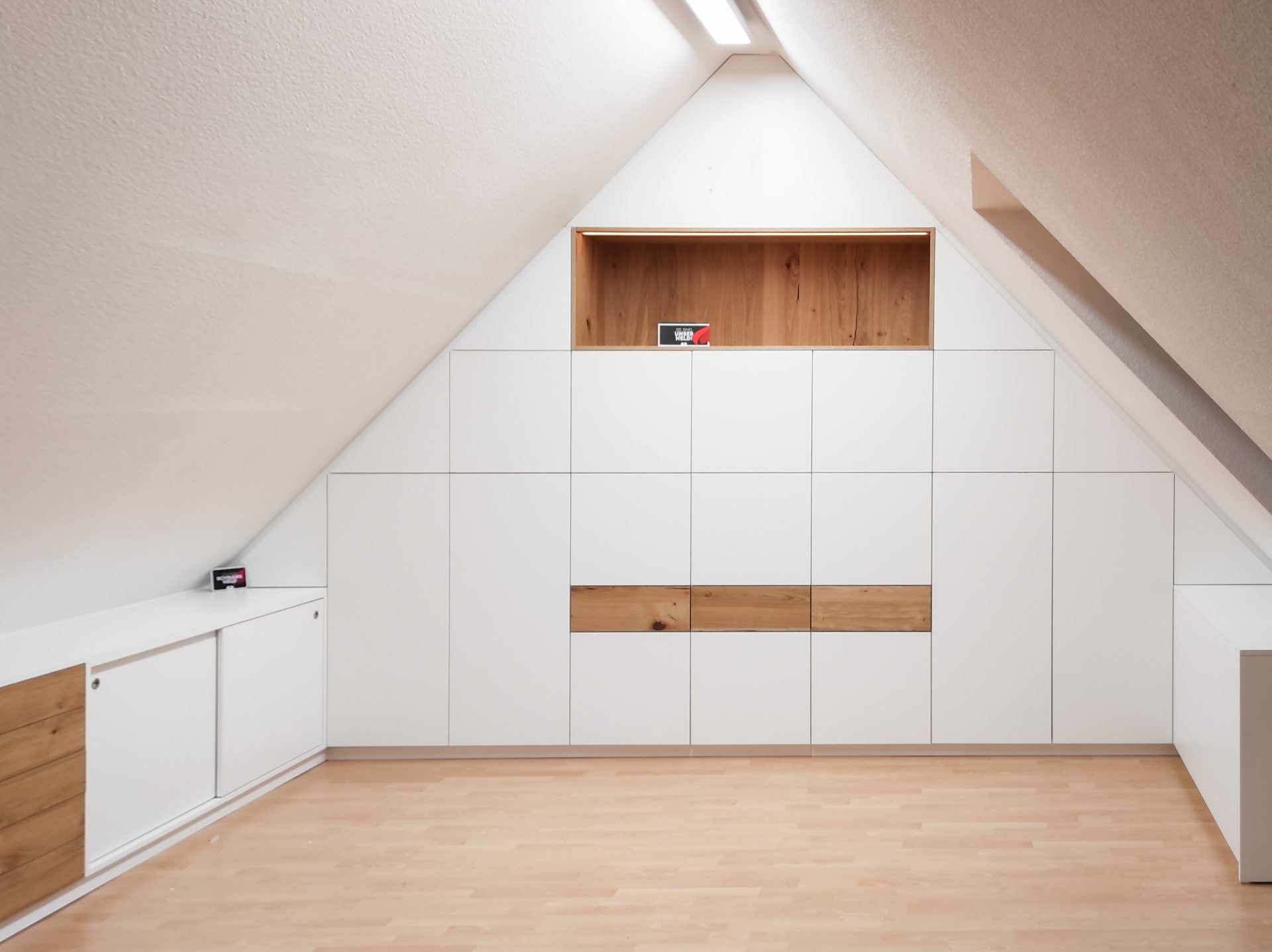 A custom-made sloping roof cabinet makes optimal use of the space under the sloping roof. Whether you are looking for a wall cabinet for a sloping roof, a clever cabinet system for sloping walls, or a built-in cabinet with special surfaces under the sloping roof, we will manufacture your cabinet individually and with millimeter precision.