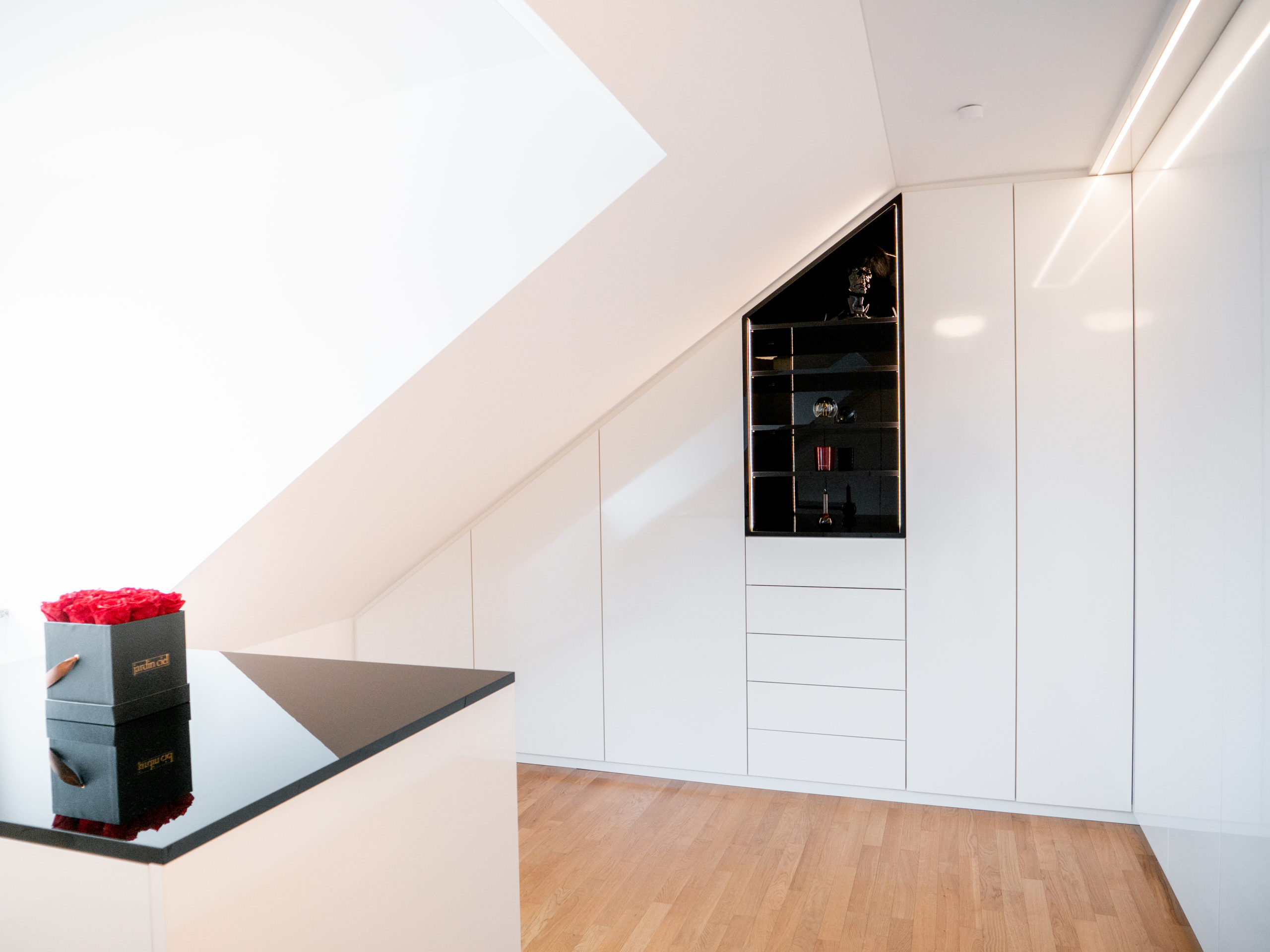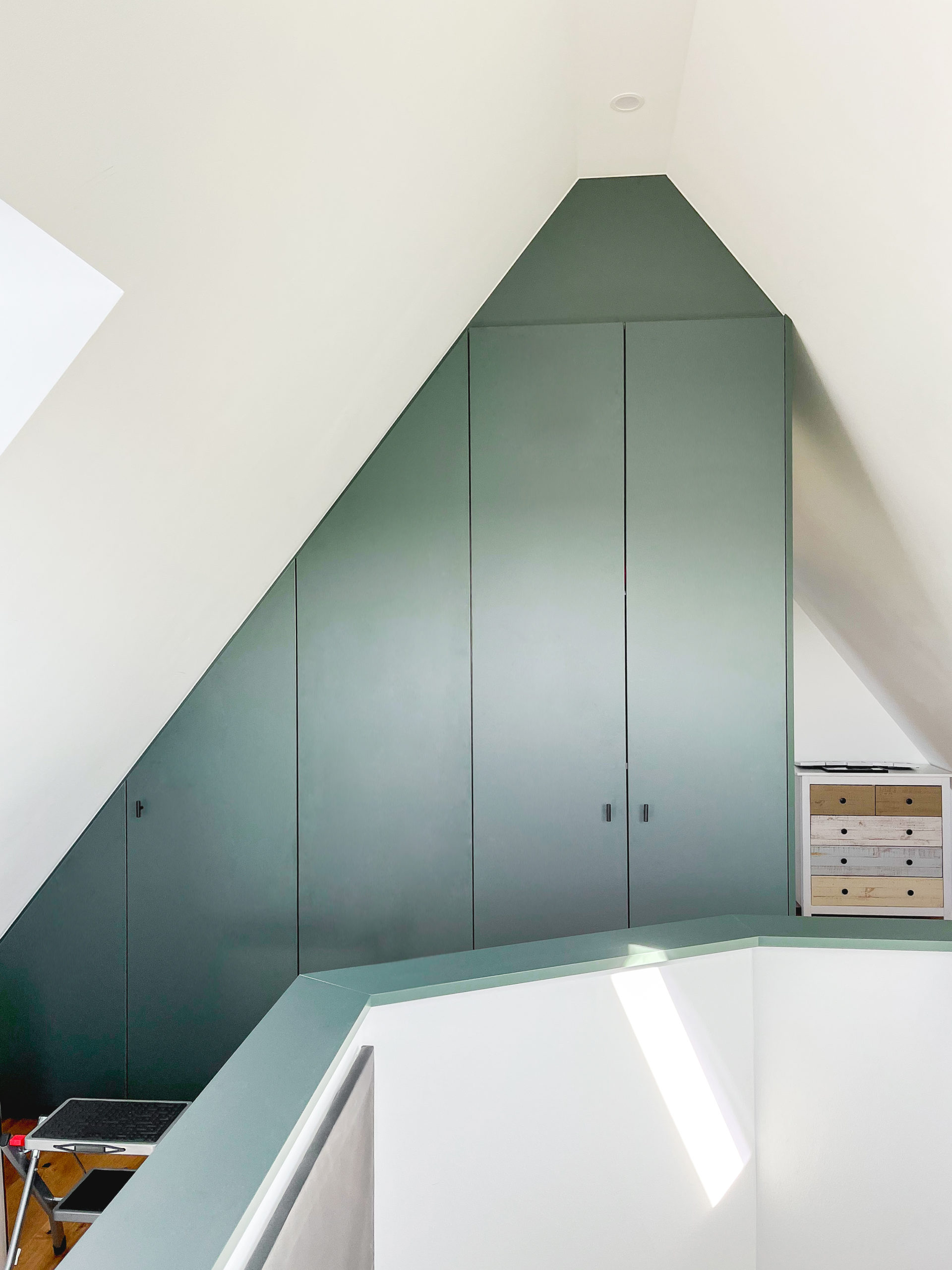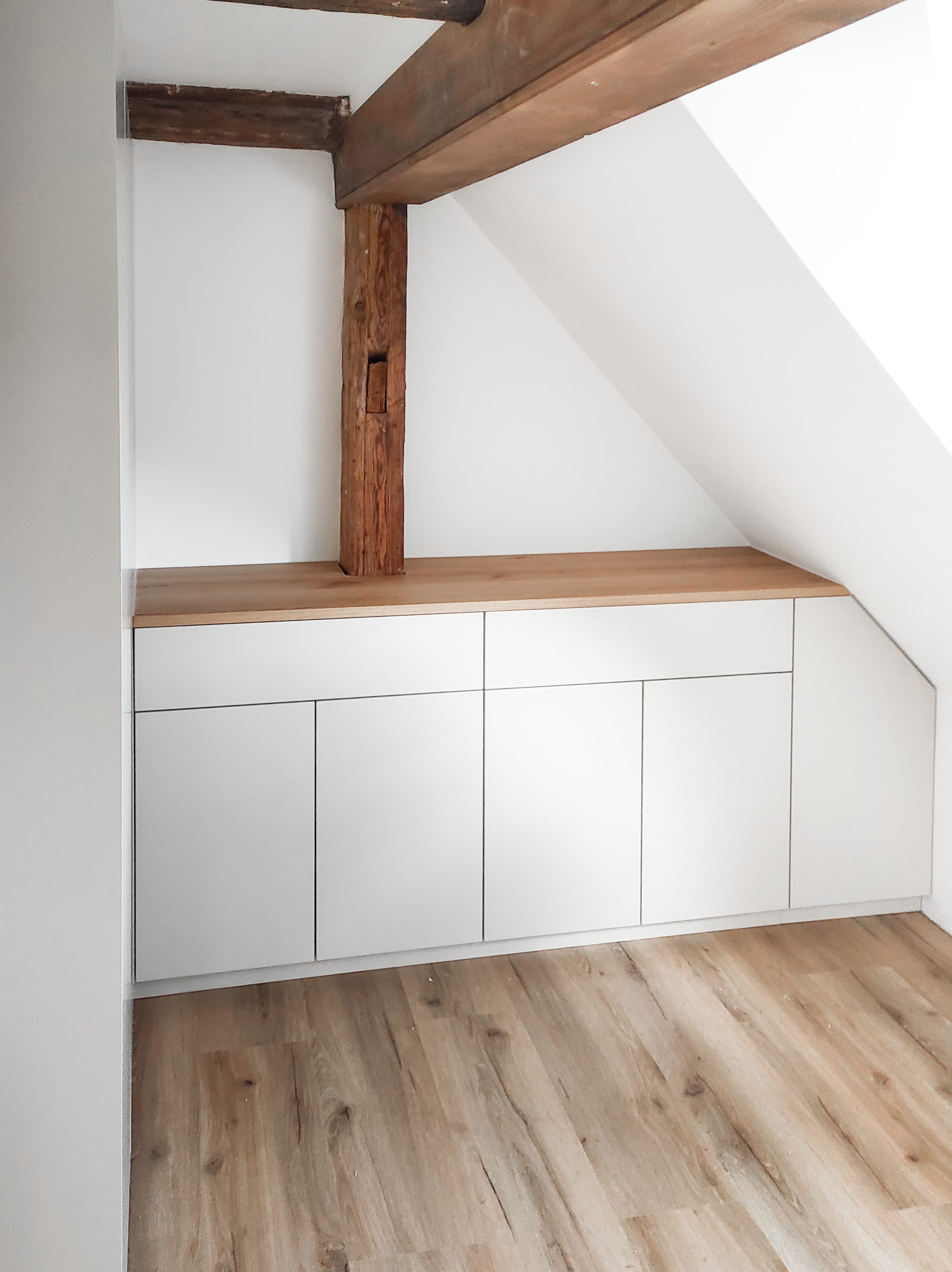 A custom-made sloping roof cabinet makes optimal use of the space under the sloping roof. Whether you are looking for a wall cabinet for a sloping roof, a clever cabinet system for sloping walls, or a built-in cabinet with special surfaces under the sloping roof, we will manufacture your cabinet individually and with millimeter precision.