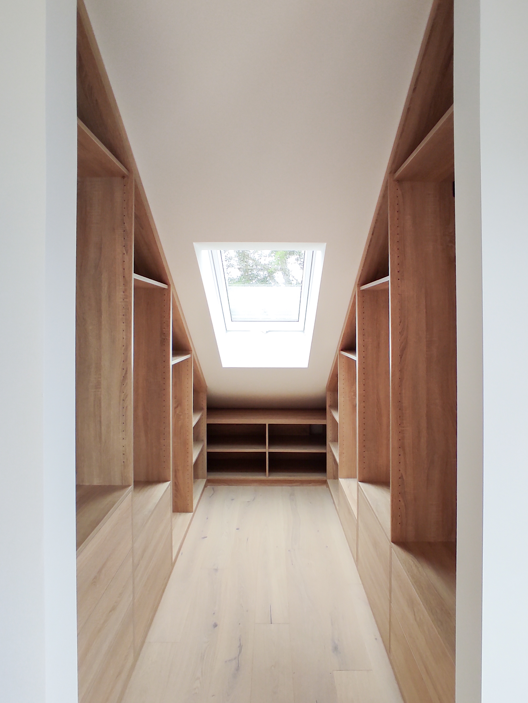Our cabinet solutions for sloping roofs are ideal for bedrooms, hallways, or attics. Whether open, with doors, or shelves, we will design a built-in cabinet under your sloping roofs that fits your needs perfectly.
