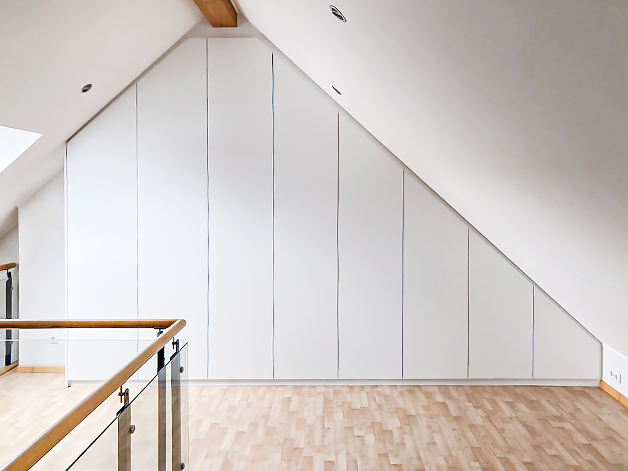 When manufacturing a custom-made sloping roof cabinet, precise measurements and careful consideration of the angles play a decisive role, especially for doors located under the slope. This ensures perfect integration into the existing space and offers the following advantages: