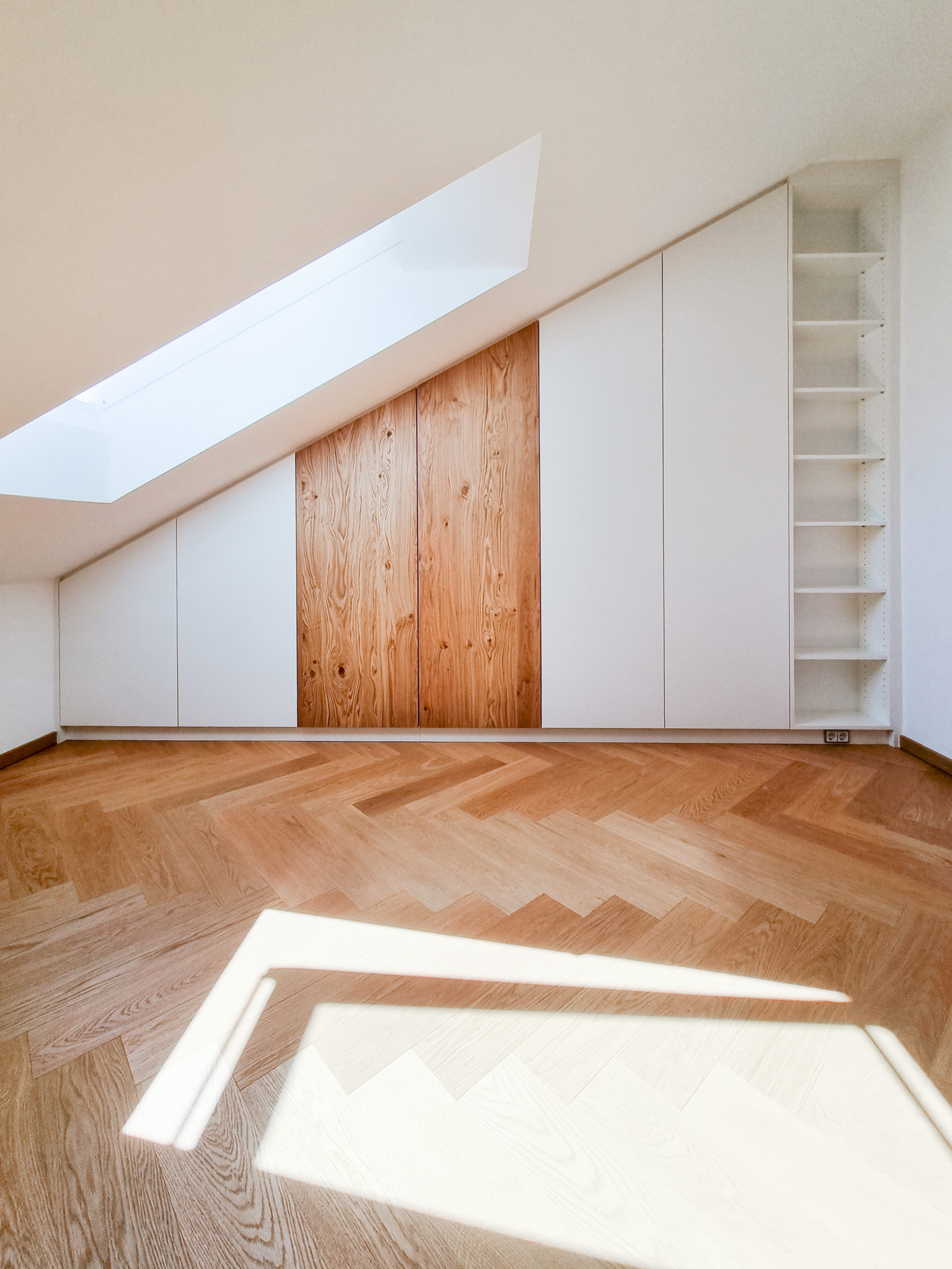 And best of all, you don’t have to choose between design and storage space – we combine both. From modern wall cabinets with sloping tops to drawer solutions under the sloping roof to compact wall units with skylight recesses: our carpentry solutions for sloping roofs put an end to empty corners and half measures.