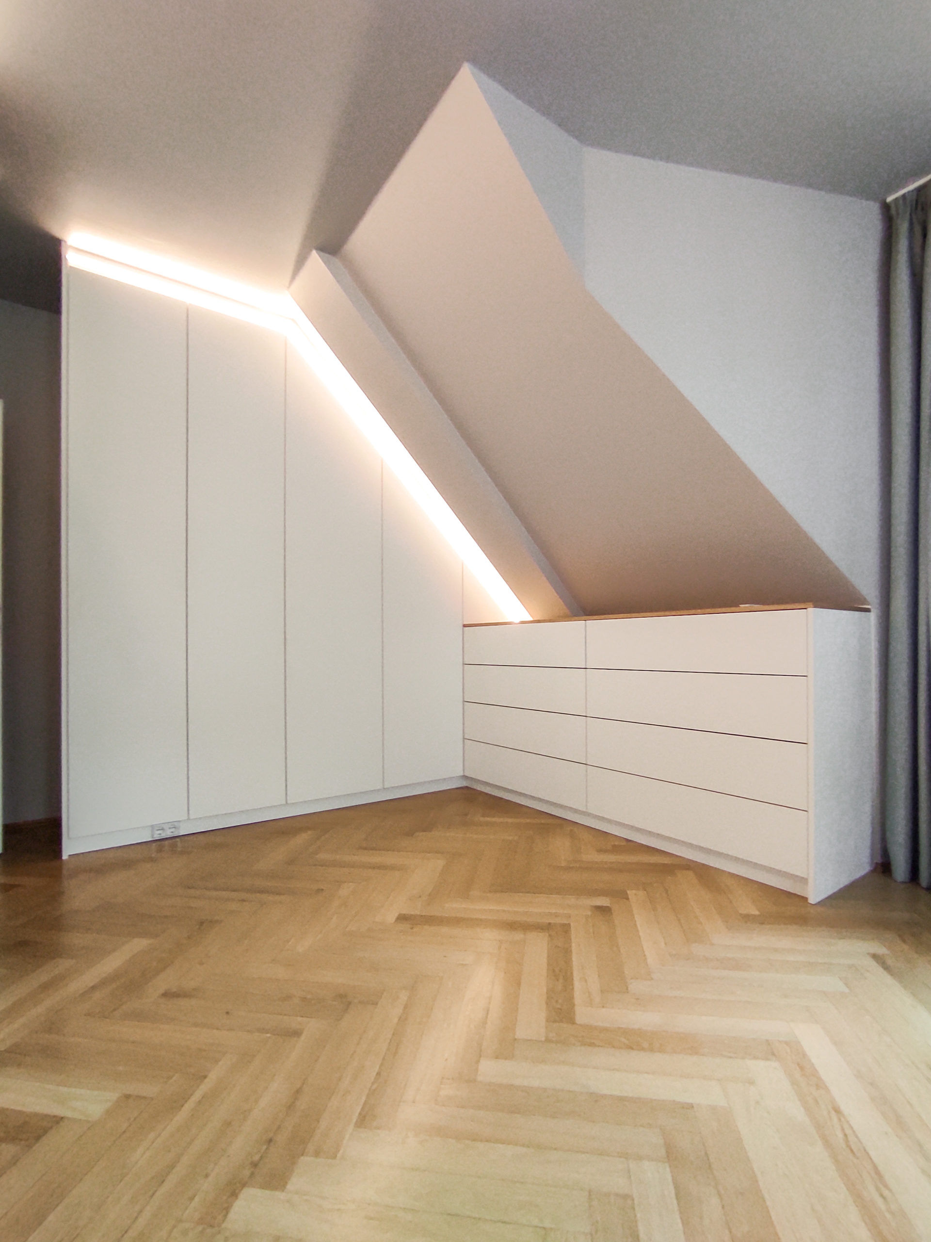 With a custom-made sloping roof cabinet, you can make clever use of every corner—whether in the bedroom, dressing room, guest room, or attic. We provide you with custom-made furniture for sloping ceilings that blends in visually, is functionally well thought out, and creates real space savings.